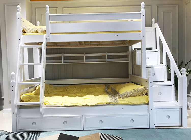 【品牌】金多喜 【产品名称】橡胶木儿童床子母床 【型号】XJM051 【风格】美式 【材质】实木 【产品尺寸】参见金多喜商城 【产品产地】江苏徐州 【是否有安全拦板】有安全拦板 【家具结构】框架结构 【产品颜色】白色、蓝白、粉白 【产品五金】五金配件 【款式定位】品质奢华型
